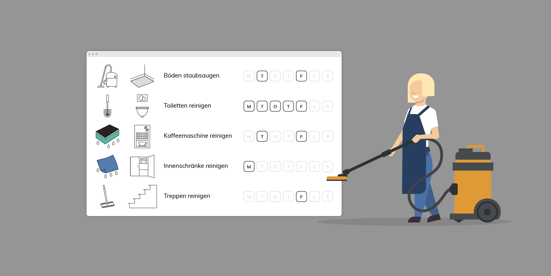 Eine Putzplanvorlage hilft Ihnen dabei, tägliche, wöchentliche und monatliche Reinigungsaufgaben effizient zu organisieren. Mit CleanManager können Sie individuelle Putzpläne erstellen, die genau auf die Anforderungen Ihrer Kunden und Mitarbeiter zugeschnitten sind. So stellen Sie sicher, dass keine Aufgabe vergessen wird und alle Arbeiten termingerecht abgeschlossen werden.